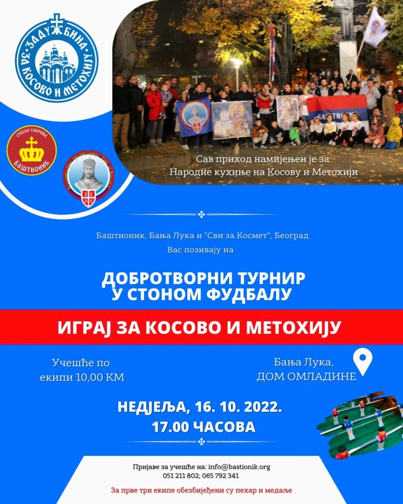 Играј за Косово и Метохију!!! Србско сабрање Баштионик и Хуманитарна организација „Сви за Космет“ из Београда Вас позивају да учествујете на ЧЕТВРТОМ ДОБРОТВОРНОМ ТУРНИРУ У СТОНОМ ФУДБАЛУ. Сав приход од турнира намијењен је за куповину 40 m³ огревног дрвета неопходног за припрему оброка у Народној кухињи у Прековцу (Ново Брдо), на Косову и Метохији. Учешће […]