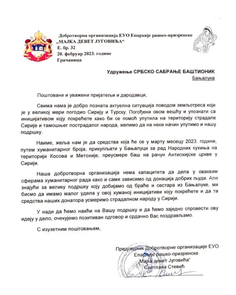 Позивом на број 17766 прилажете 2 КМ православној цркви и народу у Сирији, пострадалим у земљотресу. Обавјештавамо вас да је говорна порука из техничких разлога непромијењена. Али, управо вољом Срба са Косова и Метохије, новац прикупљен у току марта биће уплаћен Антиохијској патријаршији. Православље нема границе!