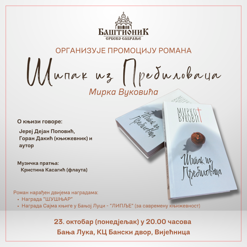 Позивамо Вас на представљање књиге „Шипак из Пребиловаца”, писца Мирка Вуковића, у издању Баштионика. 23. 10. 2023. године (понедјељак) 20.00 часова Вијећница КЦ Бански двор Бања Лука Добро дошли!
