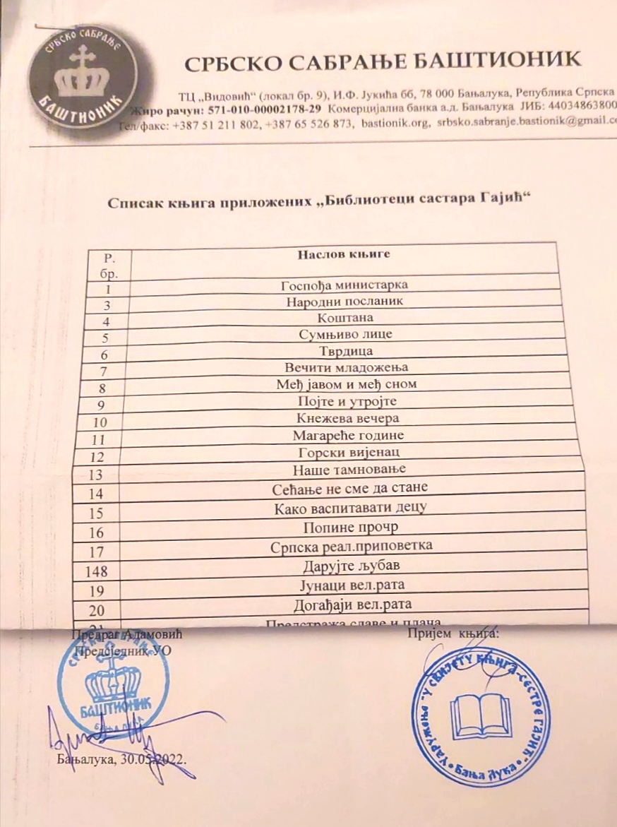 Причала нам је Сњежана о својим кћеркама и њиховој љубави према књигама. Њена жеља је да ова библиотека буде мјесто окупљања љубитеља писане ријечи и да се кроз дружења у библиотеци оживи и доживи љепота књиге. Посебан кутак је предвиђен за најмлађе чланове, у жељи да они библиотеку доживе као свој други дом. Нашом посјетом и симболичним даровањем књига подржали смо, а подржаваћемо и убудуће, ову заиста племениту и надахњујућу мисију „Библиотеке састара Гајић“.