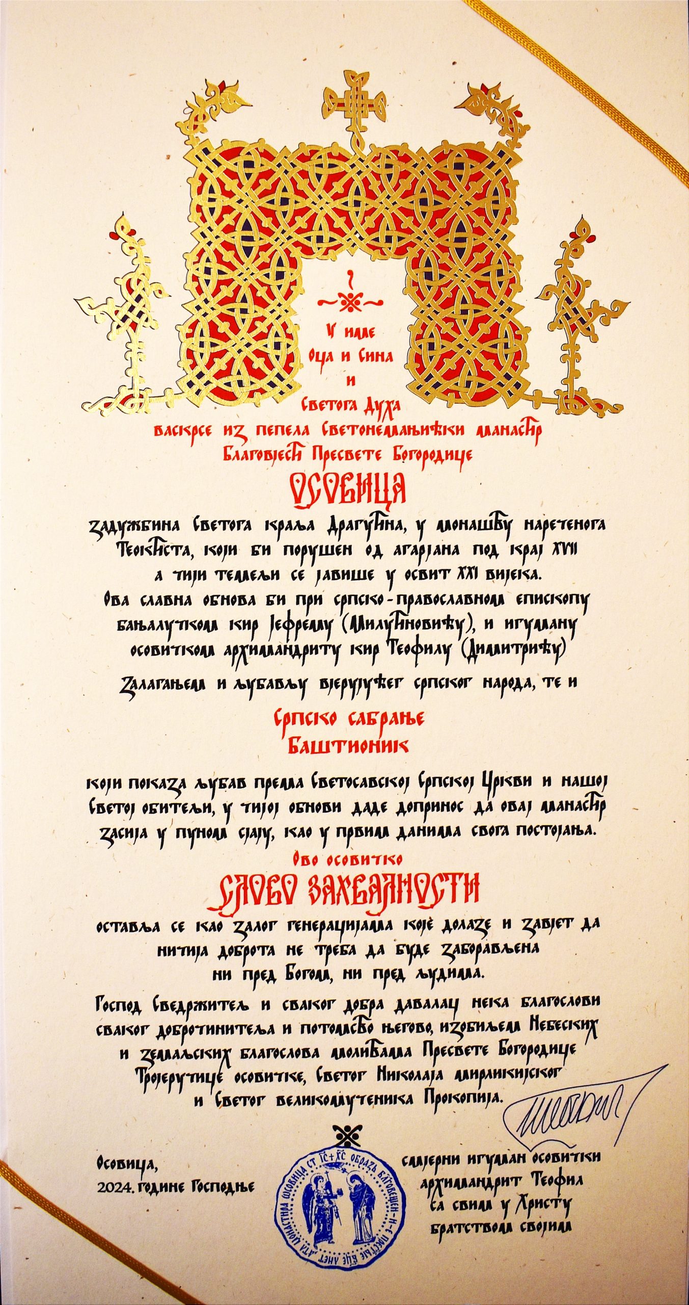 Крсну Славу нашег Сабрања, Светог владику Николаја Охридског и Жичког, и ове године прославили смо у манастиру Осовица. Захваљујемо свима који су својим учешћем увећали радост славског сабрања и допринијели молитвеном, свечаном и радосном расположењу, како и доликује истинским баштионичарима и задужбинарима и показали да испуњавамо ријечи Св. владике Николаја, да се сложимо, обожимо и умножимо.