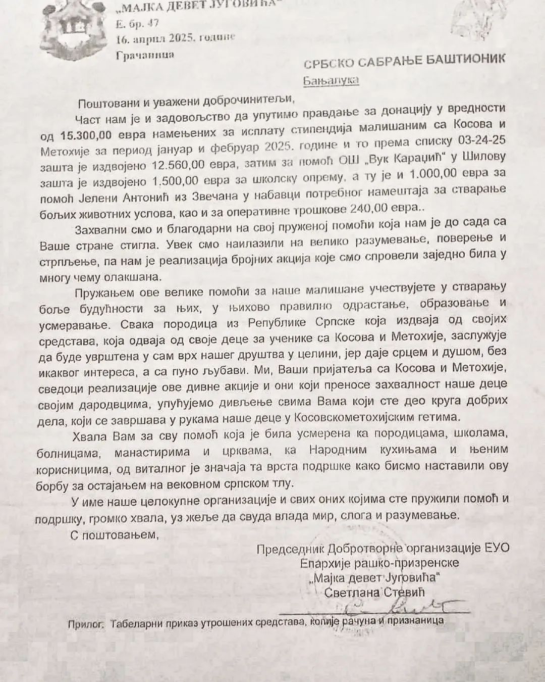 Уручивање стипендија у мјесечном износу од 50 евра и трајању од десет мјесеци, организовано је захваљујући теренској помоћи добротворне организације Епархије рашко – призренске „Мајка девет Југовића“.