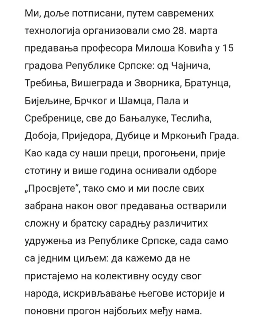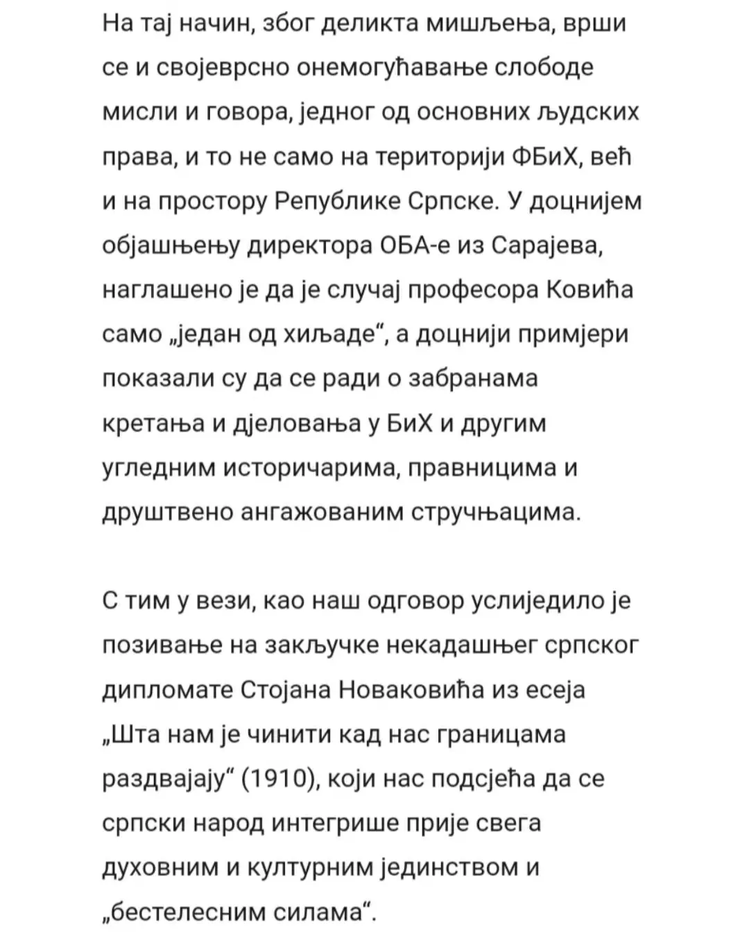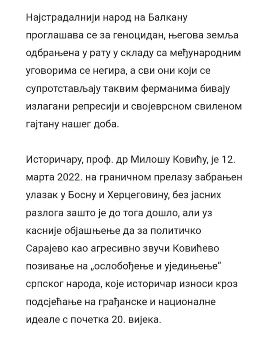 Данас, на Дан српског јединства, слободе и националне заставе, десет невладиних организација из Републике Српске, међу којима је и Србско сабрање Баштионик, упутило је отворено писмо подршке професору Милошу Ковићу. У писму се истиче да је забрана уласка у државу једном од највећих живих српских интелектуалаца без икаквог образложења апсолутно недопустива, те подсјећа јавност да очигледно постоје спискови оних који су непожљени за неке са ове стране Дрине.