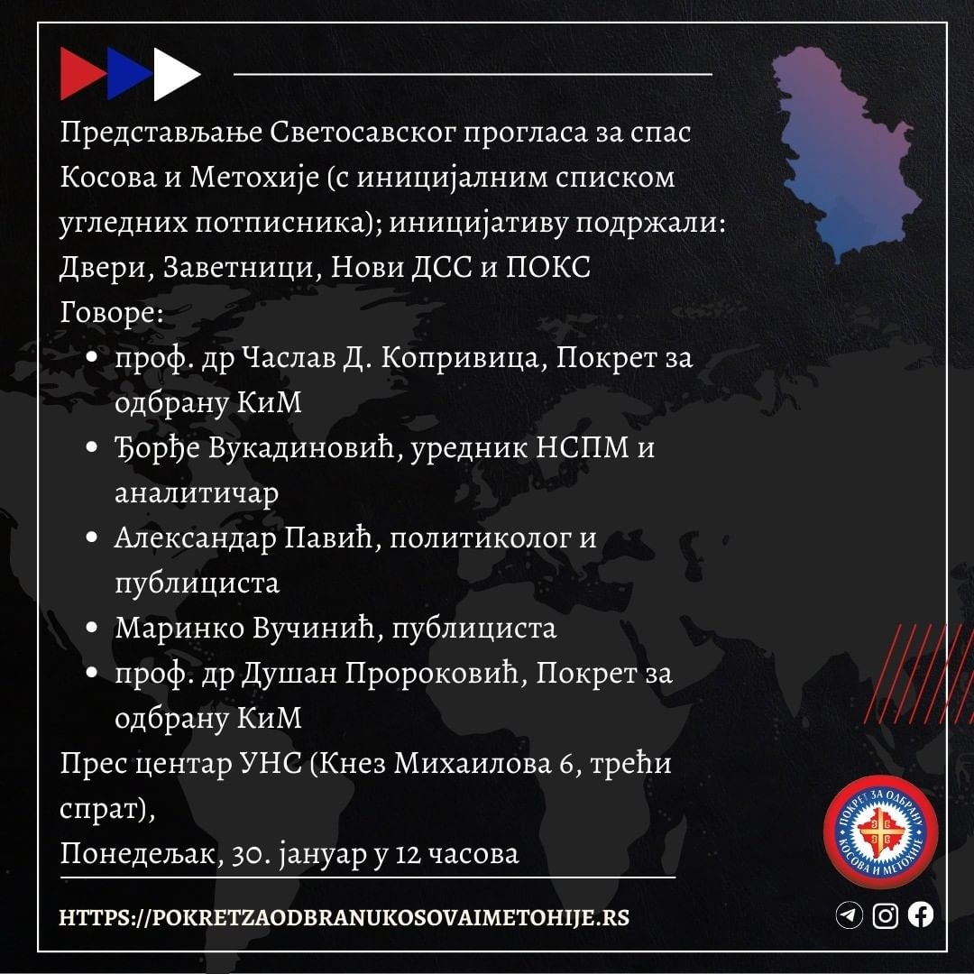 Упозоравајући јавност да у случају поклањања државности „Косову“ од стране Србије за кратко време Срба тамо не би било, а да би нам НАТО испоставио нове територијалне захтеве и ултиматуме…”