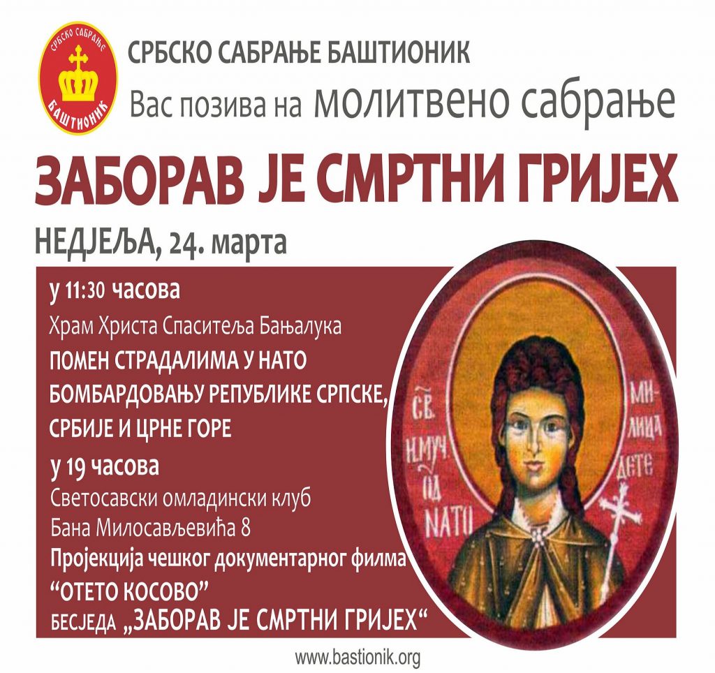 Србско сабрање Баштионик вас позива на молитвено сабрање ЗАБОРАВ ЈЕ СМРТНИ ГРИЈЕХ недјеља 24. март 11:30 часова, Храм Христа Спаситеља, Бања Лука Помен страдалима у НАТО бомбардовању Републике Српске, Србије и Црне Горе 19 часова, просторије Светосавског културног клуба, Бана Милосављевића 8, Бања Лука – Пројекција чешког документарног филма „Отето Косово“ – Бесједа „Заборав је […]