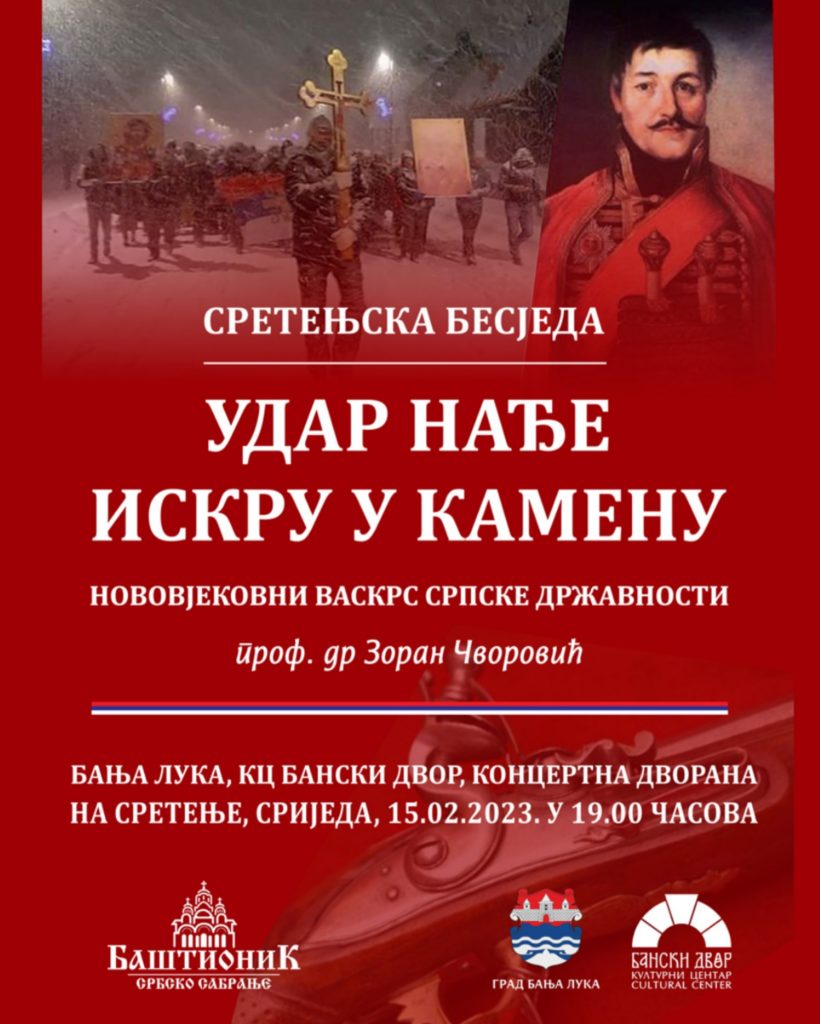“Од Сретења 1804. године, када је започео нововековни васкрс српске државности, државно уједињење је заветни циљ српског народа”. Бесједник једанаесте Сретењске бесједе је професор др Зоран Чворовић, (Правни факултет Универзитета у Крагујевцу). Сретење Господње, 15. фебруар 2023. године у 19.00 ч. Бански двор, Бања Лука Добро дошли!
