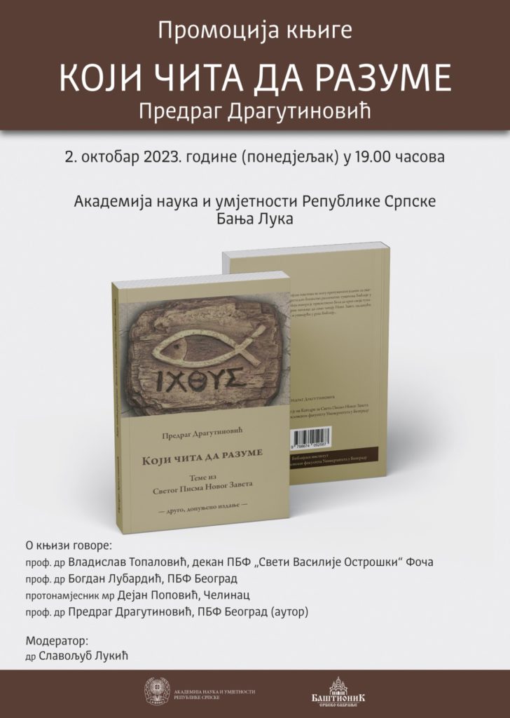 Част нам је и задовољство позвати вас на промоцију књиге професора доктора Предрага Драгутиновића „Који чита да разуме”. 2. октобар 2023. године (понедјељак) 19.00 часова Академији наука и умјетности Републике Српске Бања Лука Добро дошли!