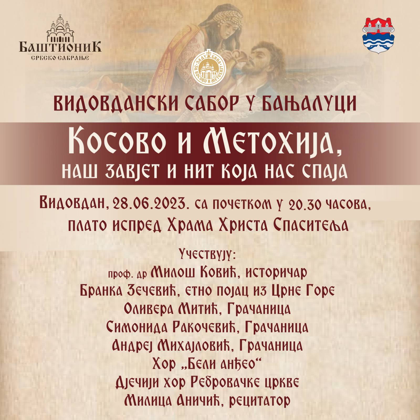Позивамо све оне којима је косовски завјет у срцу и души да на Видовдан у 20.30 ч дођу у порту Храма Христа Спаситеља да заједно пошаљемо поруку подршке нашој браћи и сестрама на Косову и Метохији.